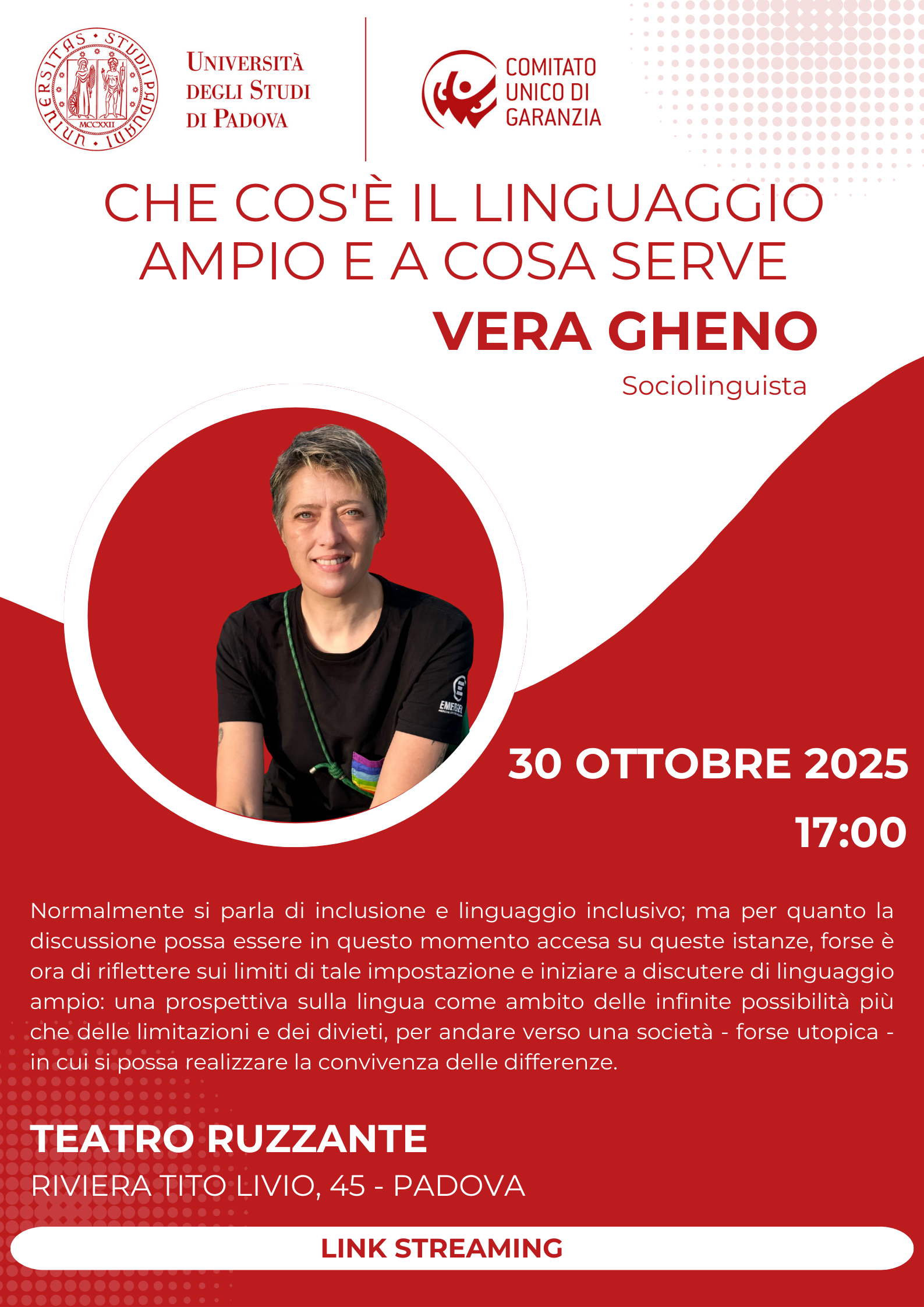 L'evento si svolgerà alle ore 17 presso il Teatro Ruzzante (Riviera Tito Livio 45, Padova).